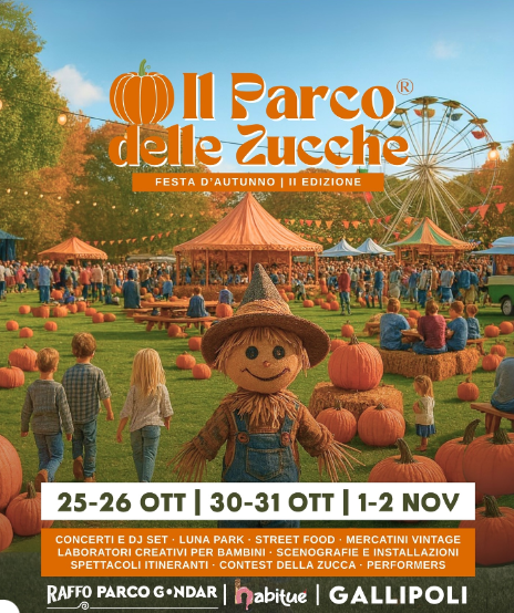 - Per tutta la famiglia: concerti e DJ set, street food internazionale e salentino, spettacoli teatrali e circensi, stage di ballo Country (ticket extra) e il famoso contest della zucca più grande con premio di 500€.